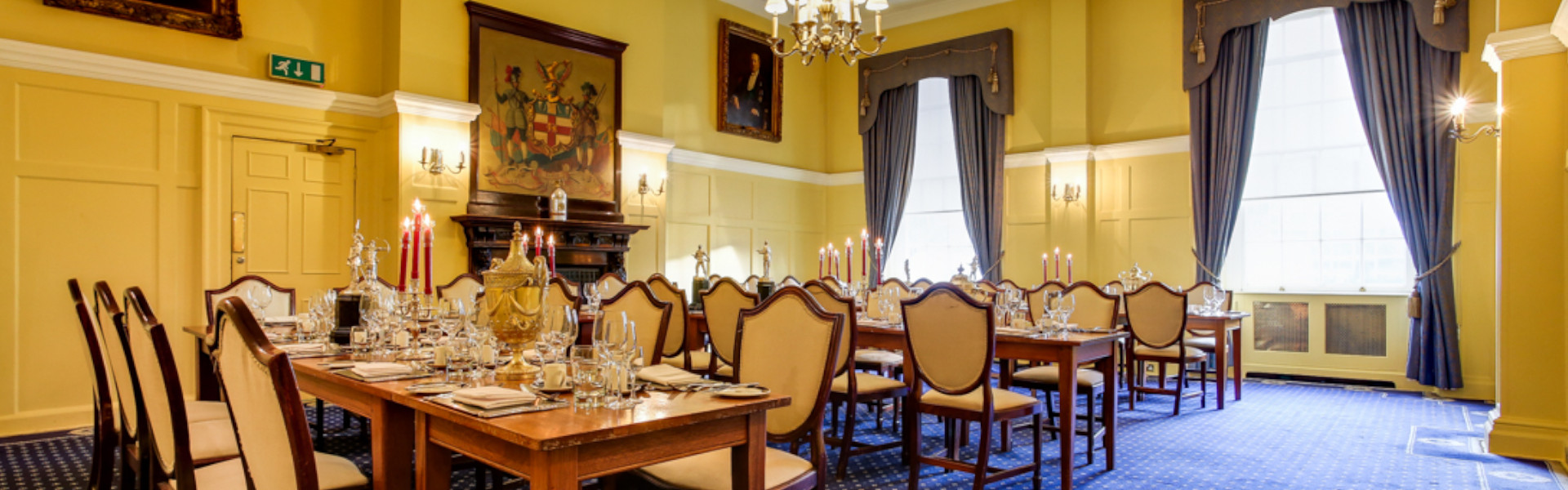 The striking blue and yellow colour scheme creates a fabulous energy in the Queen’s Room. Around the space hangs a series of impressive portraits including one of a young Queen Elizabeth II and the huge windows, which overlook Artillery Garden, fill the room with daylight.